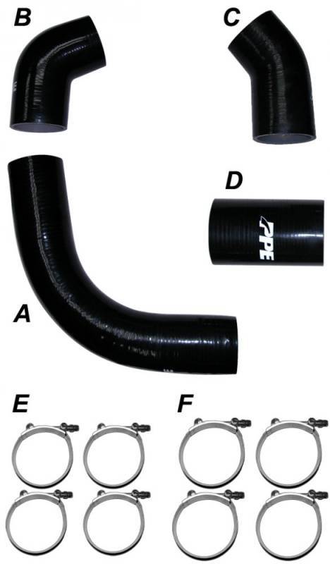Replace your intercooler boots or almost any other boot or hose on your rig with a set of upgraded heavy duty Silicon Hoses from PPE. PPEs Silicone Hoses are constructed using Fluorocarbon lined, silicon rubber that is strengthened with five plies of Nomex fibers. This design results in a hose that resists fuel, oil, UV, ozone, as well as various other chemicals plus it has a burst rating of over 200 psi from negative 76 degrees to 437 degrees Fahrenheit. Simply put, these will be the last hoses and boots you will ever buy. Available in various bends and straights with sizes from 2.5 inches up to 6 inches in diameter. Complete intercooler boot kits for many late-model diesel equipped vehicles are also available.
