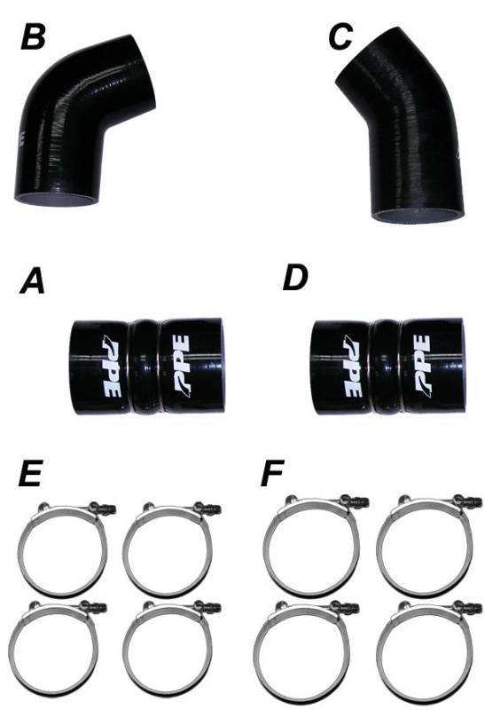 Replace your intercooler boots or almost any other boot or hose on your rig with a set of upgraded heavy duty Silicon Hoses from PPE. PPEs Silicone Hoses are constructed using Fluorocarbon lined, silicon rubber that is strengthened with five plies of Nomex fibers. This design results in a hose that resists fuel, oil, UV, ozone, as well as various other chemicals plus it has a burst rating of over 200 psi from negative 76 degrees to 437 degrees Fahrenheit. Simply put, these will be the last hoses and boots you will ever buy. Available in various bends and straights with sizes from 2.5 inches up to 6 inches in diameter. Complete intercooler boot kits for many late-model diesel equipped vehicles are also available.
